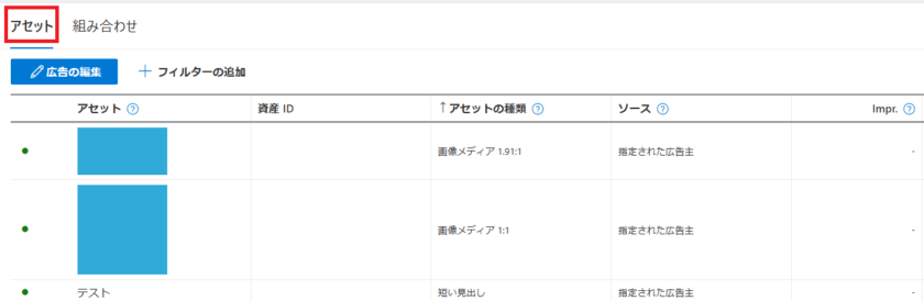 マルチメディア広告は、設定したアセットがどのように表示されているか、また、パフォーマンスが高いアセットの組み合わせを確認することが可能です。