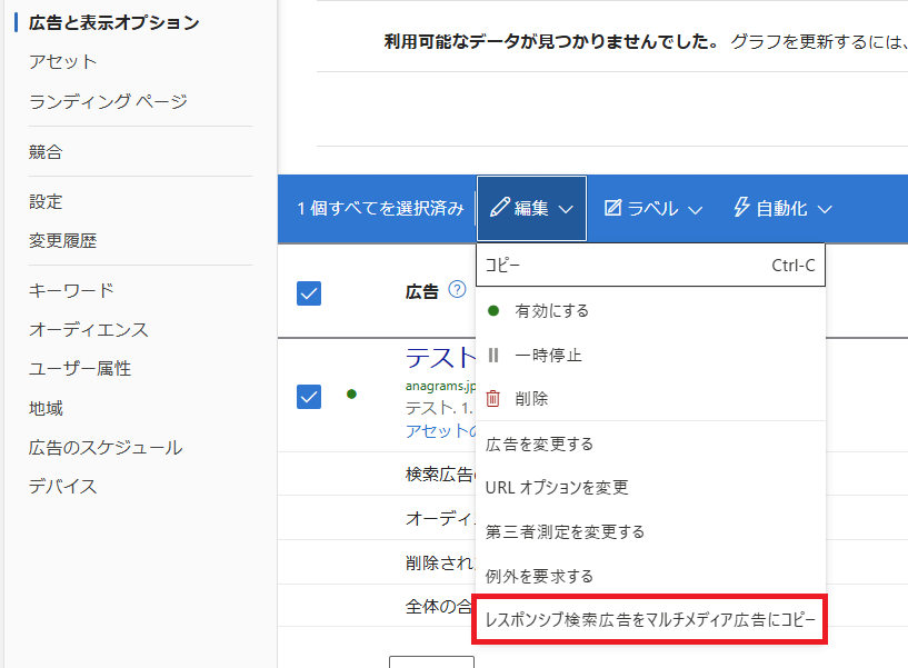 2.マルチメディア広告にコピーするレスポンシブ検索広告を選択して、[編集] > [ レスポンシブ検索広告をマルチメディア広告にコピー] を選択します。