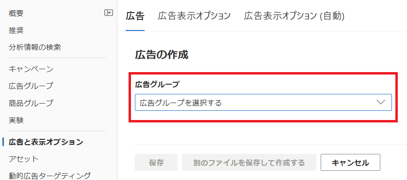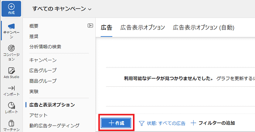 1.管理画面の左側メニューで [キャンペーン]を選び 、 [広告と表示オプション] > [広告]を選択した後に、[広告の作成] をクリックします。