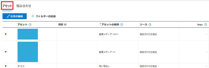 マルチメディア広告は、設定したアセットがどのように表示されているか、また、パフォーマンスが高いアセットの組み合わせを確認することが可能です。