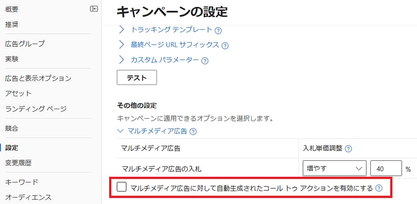 管理画面の左側メニューの[キャンペーン]にて該当のキャンペーンを選び、[設定] >[マルチメディア広告に対して自動生成されたコール トゥ アクションを有効にする]の項目のチェックボックスを外して「保存」をクリックする。