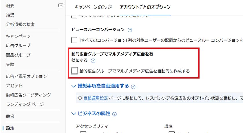 また、アカウントで動的広告グループでマルチメディア広告を自動で作成する設定になっているため、自動的に作成したくない場合は無効に設定する必要があります。