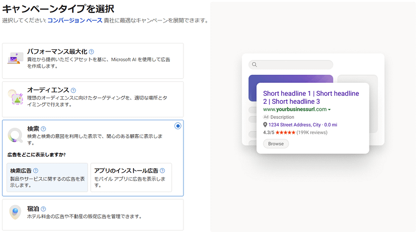 そのため、1つの検索キャンペーン内でレスポンシブ検索広告とマルチメディア広告の両方の広告タイプを作成することも可能です。