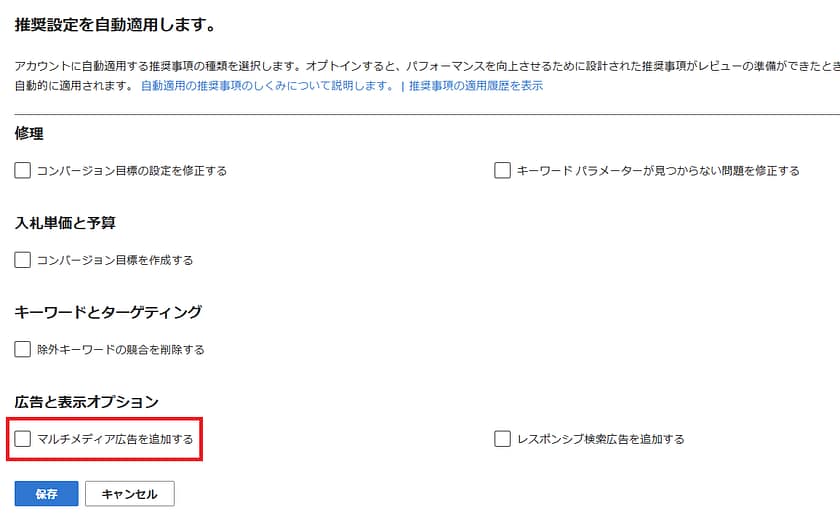管理画面の左側メニューの[設定] >[アカウントごとのオプション] > [自動適用設定]にて、[マルチメディア広告を追加する]の項目のチェックボックスを外して「保存」をクリックする。