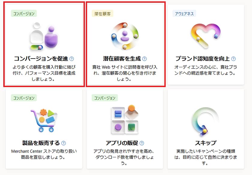 2.キャンペーンの目標に [コンバージョンを促進] または [潜在顧客を生成] を選択します。