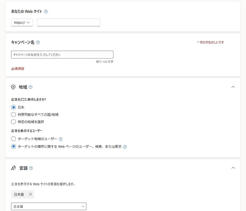 4.任意のキャンペーン名とサイトのURLを入力して、配信する地域と言語を設定します。