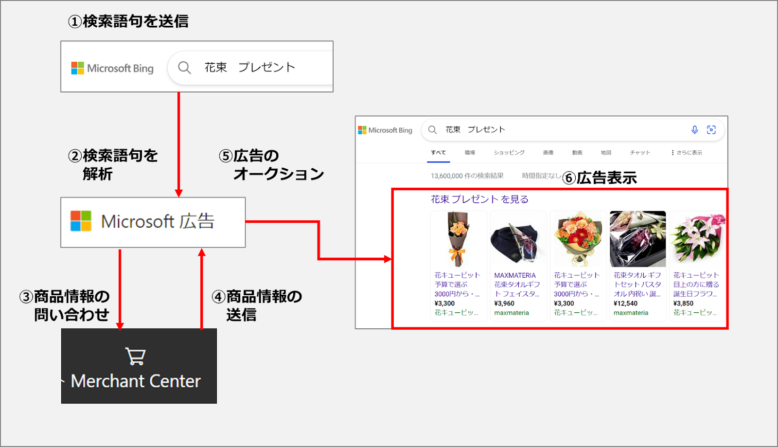ユーザーがBingで検索すると、Microsoft広告のシステムが検索語句を解析し、検索語句に関連する商品情報をMerchant Centerに問い合わせます。関連する商品があった場合、Merchant Centerから商品情報が送信されて広告が表示されます。