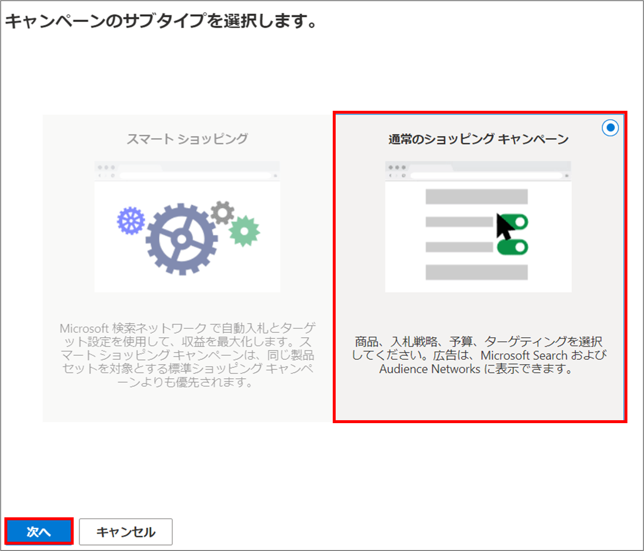 キャンペーンのサブタイプは[通常のショッピングキャンペーン]を選択します。