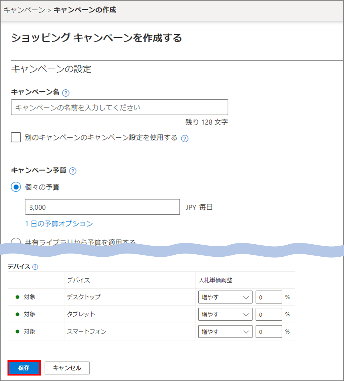 最後に、キャンペーン設定を行います。キャンペーン予算や入札、ターゲティングなどを一通り設定したら、[保存]をクリックしてショッピングキャンペーンの設定は完了です。