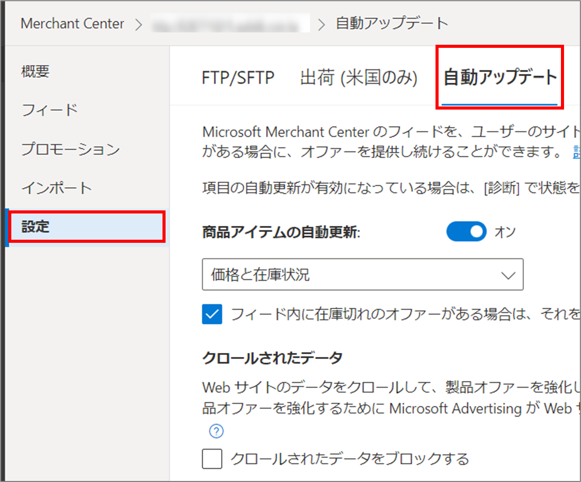 Merchant Centerを開き、[設定]より、[自動アップデート]をクリックします。