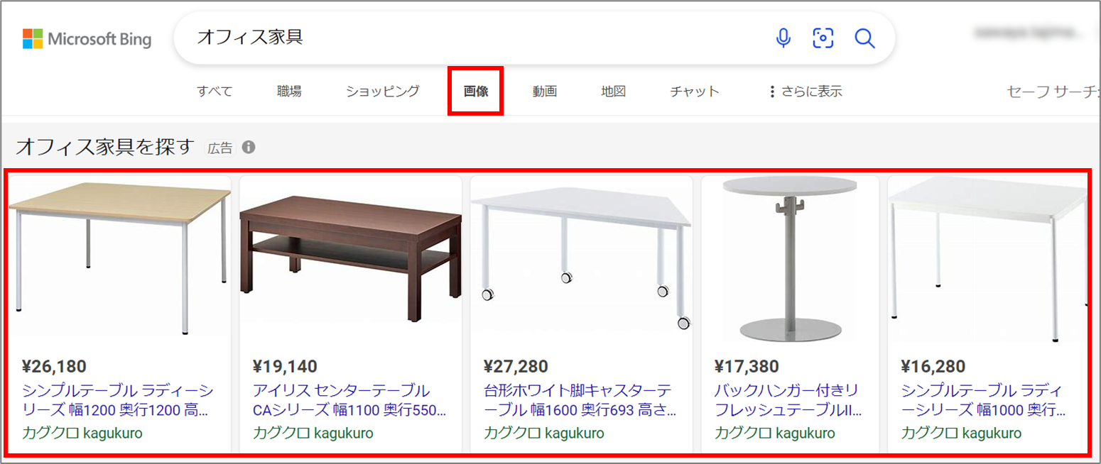 ショッピング広告は、ユーザーがBingにて検索したときにその検索語句に応じて表示されます。商品画像や価格などの商品情報や販売者情報を一目で見ることができて、検索広告よりも上部に掲載できる可能性がある視認性の高い広告メニューです。