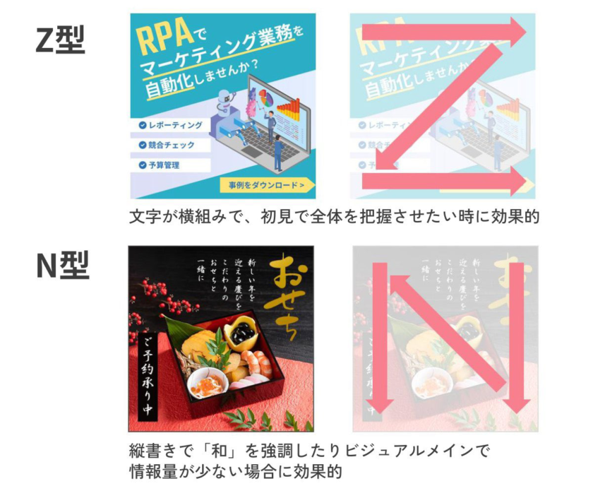「視線誘導」とは、目線の動きを意識して、意図した順序で見てもらえるようにする手法のこと。