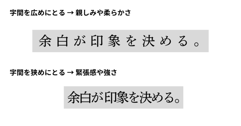 行間も文字間も、詰まりすぎると窮屈な印象になります。スペースに余裕がある場合は少し広めに設定しましょう。勢いのあるコピーの場合は、あえて文字間を詰めることで躍動感を出すことができます。