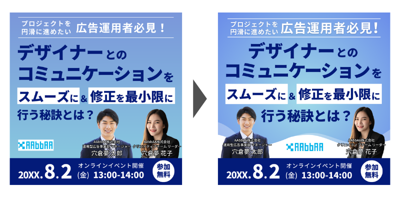 制作いただいたバナーではメインコピーの右上部分が空いてしまい、少し寂しい印象でしたが、中央揃えにすることで改善されています。