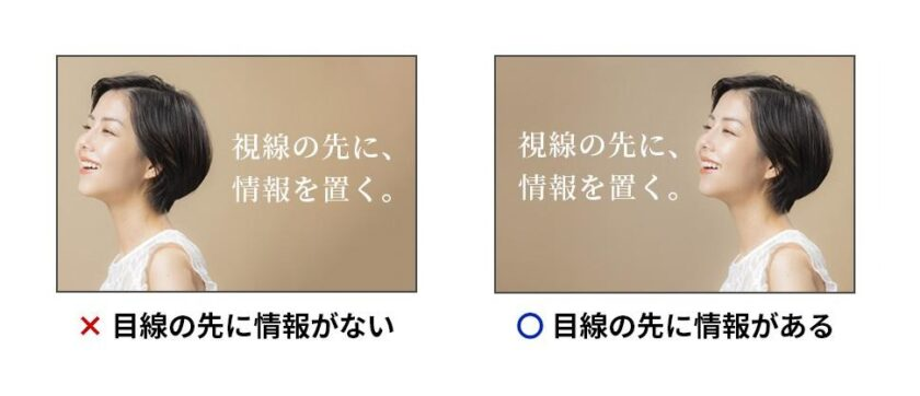 人は無意識に第三者の目線の先に注目してしまうので、人物や動物の素材を使用するときは、その先に伝えたい情報がくるようテキストを配置しましょう。