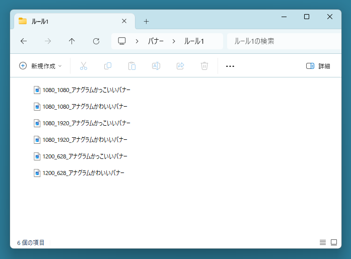 名前を昇順で並び替えたフォルダ内の見え方では(名前昇順の場合)、命名ルール1ではサイズ毎に並ぶように表示されるのに対し、命名ルール2では画像特徴毎に並ぶように表示されることになります。どちらの並びが扱いやすいかは使用者によって見解はわかれるでしょう。