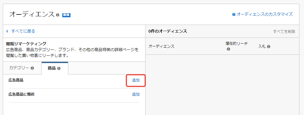 広告対象商品もしくはその類似商品の閲覧ユーザーを対象としたい場合は、タブで「商品」を選択します。そこから対象のオーディエンスの「追加」ボタンをクリックします。