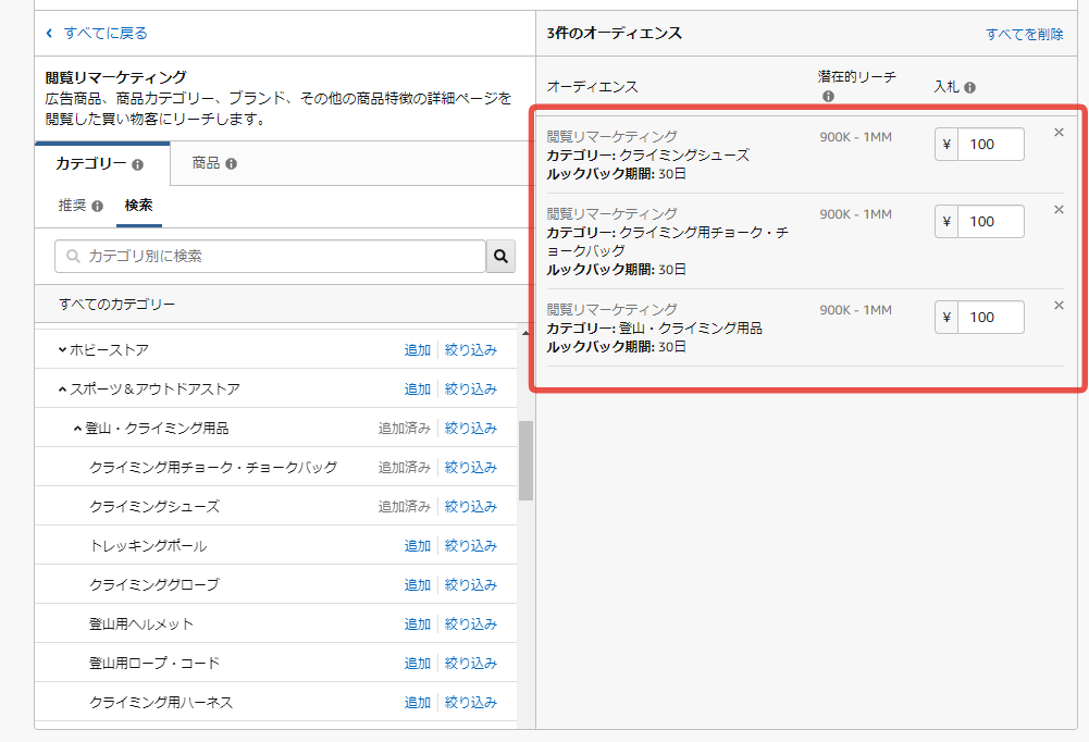 1つのキャンペーン内で、複数の閲覧リマーケティングおよびAmazonオーディエンスを追加し、組み合わせることが可能です。またオーディエンス別に入札価格の調整もできます。逆に、AND条件(例:商品詳細ページ閲覧30日以内のオーディエンス"かつ"ゴルフに興味・関心のあるユーザーなど)での組み合わせはできないのでご注意ください。