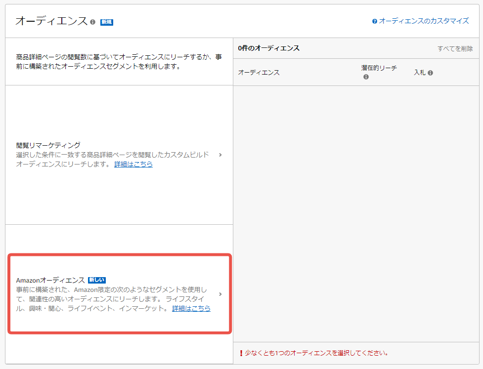 オーディエンスの項目から「Amazonオーディエンス」を選択します。