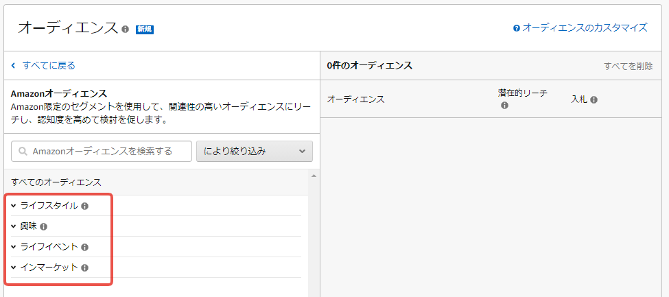 Amazonオーディエンスの言語表記はデフォルトだと英語と日本語が混在しています。また、オーディエンスを検索する機能もあるのですが、日本語と英語で検索結果が変わることもあるため要注意です。このあたりは、追って仕様がアップデートされるかもしれません。