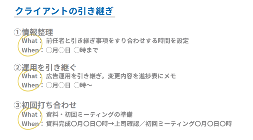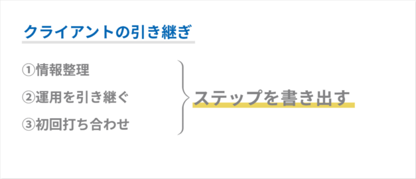 たとえば、①情報整理というステップに対して「前任者との引き継ぎミーティングを設定」というWhatを書き出したとします。すると、打ち合わせまでにやらなければいけないこととして、クライアントの情報がまとまっているシートや月次レポートの確認、施策の流れやアカウントの運用履歴の把握など、芋づる式にWhatが出てくるかもしれません。これらをすべて書き出しましょう。