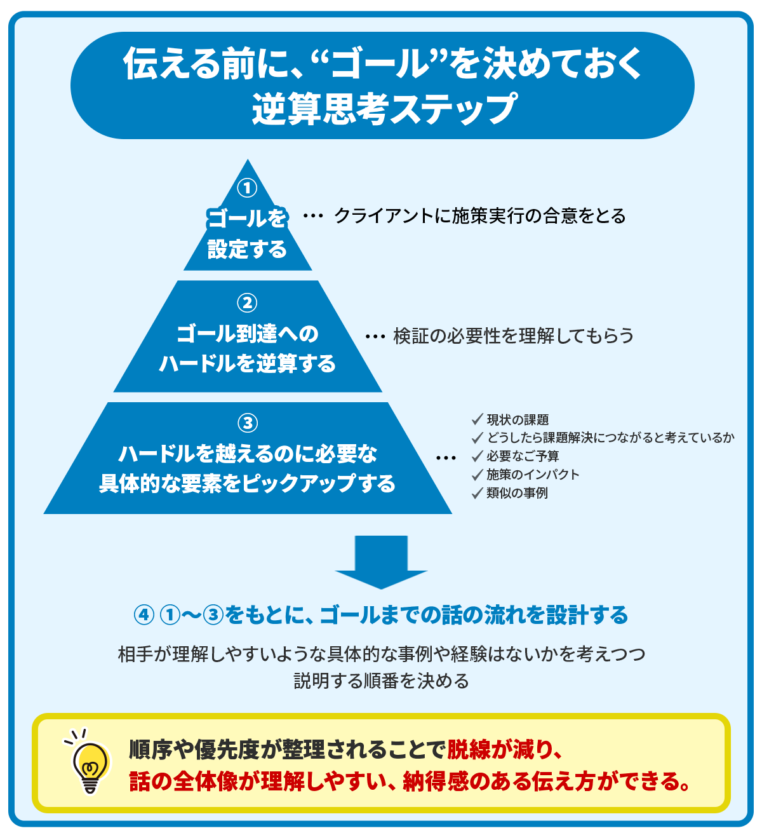 「この提案で何を決めたいのか」「どの課題を解決したいのか」を逆算して話すと、順序や優先度が整理され、脱線が減ります。その結果、相手は話の全体像を理解しやすくなり、納得感を持って議論に参加できるようになります。