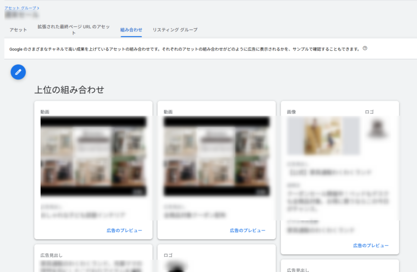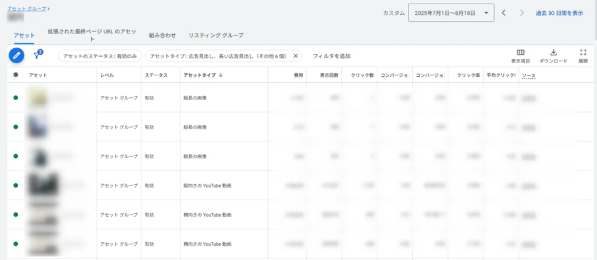 4.「アセット」タブで画像・動画・見出し・説明文ごとの表示回数・コンバージョン数を確認