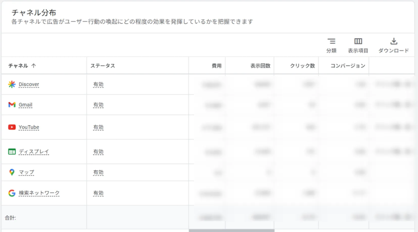 「チャネルパフォーマンスレポート」では、「検索ネットワーク」「ディスプレイ」「YouTube」「Gmail」「Discover」「マップ」といった、P-MAXが自動で配信している各チャネルの成果を確認できます。
