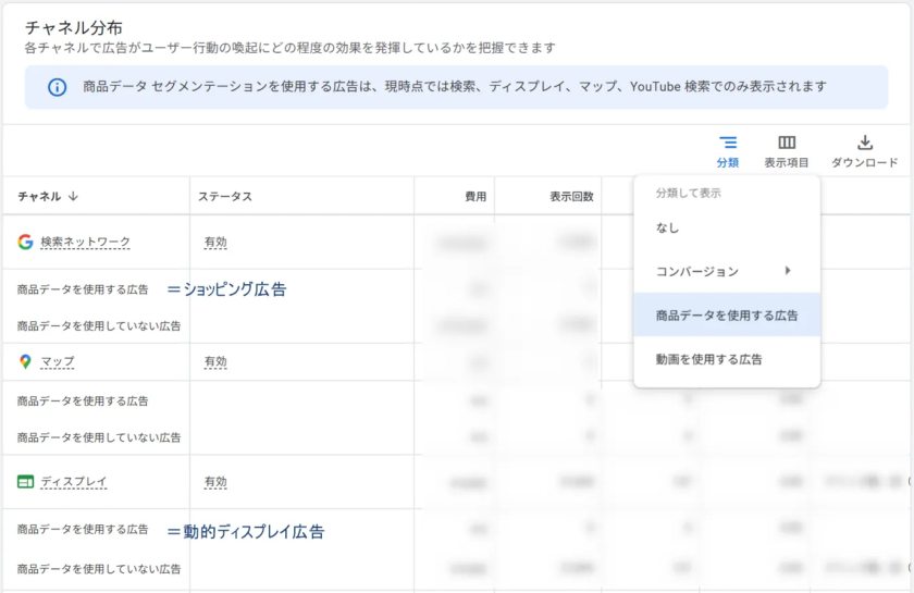 ECなどで商品データも活用している場合、ショッピングやディスプレイ面が全体の成果に影響を与えることが多いため、分類から「商品データを使用する広告」を選択し、確認することをおすすめします。