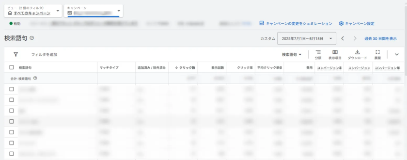 このような場合、広告を届けたいユーザーと、実際にクリックしているユーザーの間に「ズレ」が生じている可能性が高いです。「検索語句レポート」を使い、どのような検索語句で広告が表示されているかを確認し、そのズレの原因を特定しましょう。