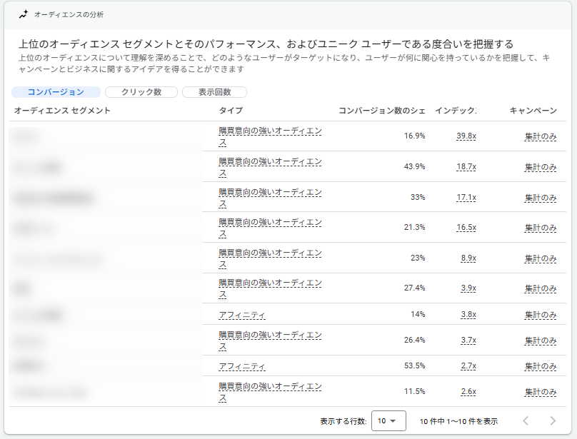 オーディエンスの分析で「どんなユーザー層が特に成果を上げているか」を把握することは、新規顧客へのアプローチを考える上で有効なヒントになります。特に注目すべきは、「購買意向の強いオーディエンス」に分類されるような、コンバージョン見込みの高いセグメントです。