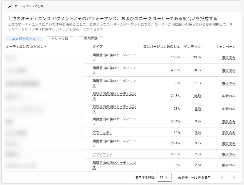 オーディエンスの分析で「どんなユーザー層が特に成果を上げているか」を把握することは、新規顧客へのアプローチを考える上で有効なヒントになります。特に注目すべきは、「購買意向の強いオーディエンス」に分類されるような、コンバージョン見込みの高いセグメントです。