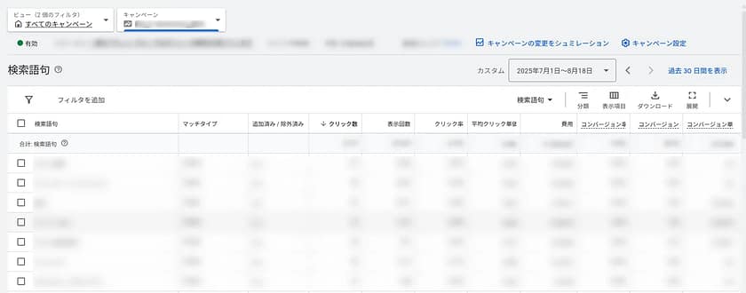 このような場合、広告を届けたいユーザーと、実際にクリックしているユーザーの間に「ズレ」が生じている可能性が高いです。「検索語句レポート」を使い、どのような検索語句で広告が表示されているかを確認し、そのズレの原因を特定しましょう。