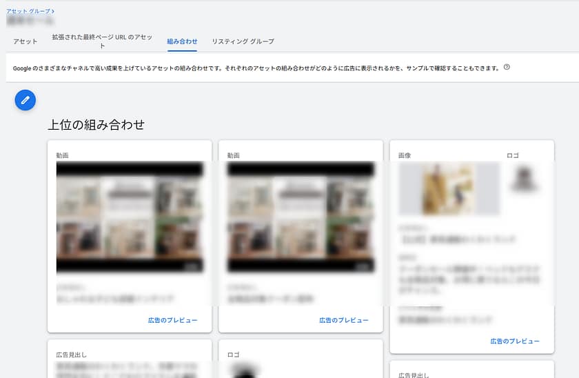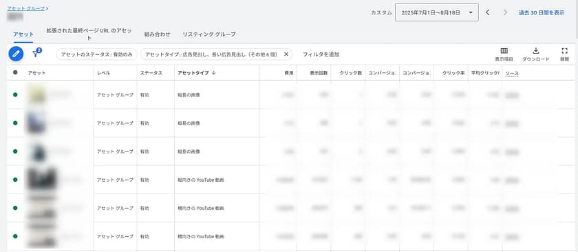 4.「アセット」タブで画像・動画・見出し・説明文ごとの表示回数・コンバージョン数を確認