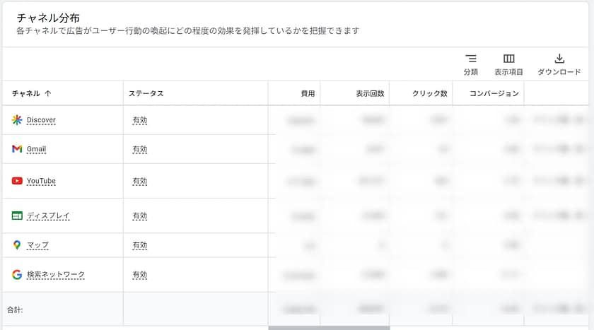 「チャネルパフォーマンスレポート」では、「検索ネットワーク」「ディスプレイ」「YouTube」「Gmail」「Discover」「マップ」といった、P-MAXが自動で配信している各チャネルの成果を確認できます。