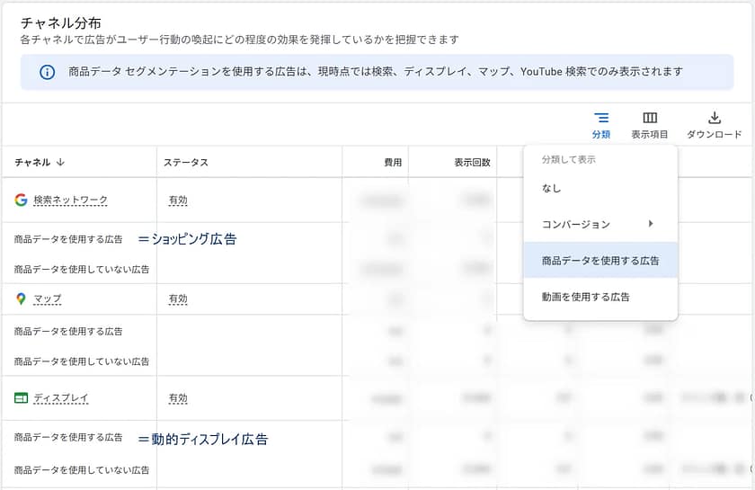 ECなどで商品データも活用している場合、ショッピングやディスプレイ面が全体の成果に影響を与えることが多いため、分類から「商品データを使用する広告」を選択し、確認することをおすすめします。