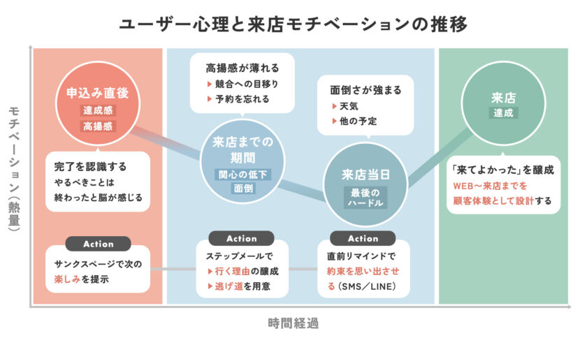 申し込みを完了した瞬間、ユーザーは達成感を得る。しかし「予約した」という事実が、心理的には「やるべきことは終わった」という感覚に変わりやすいため、来店への意識は急速に薄れていく傾向に。