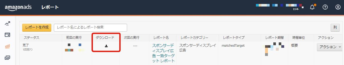 ④レポート一覧画面で、実行したレポート行の「ダウンロード」をクリック