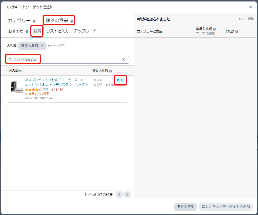 ④「個々の商品」で「検索」を選択し、ターゲティングに追加したい商品のASINを検索して「追加」をクリック