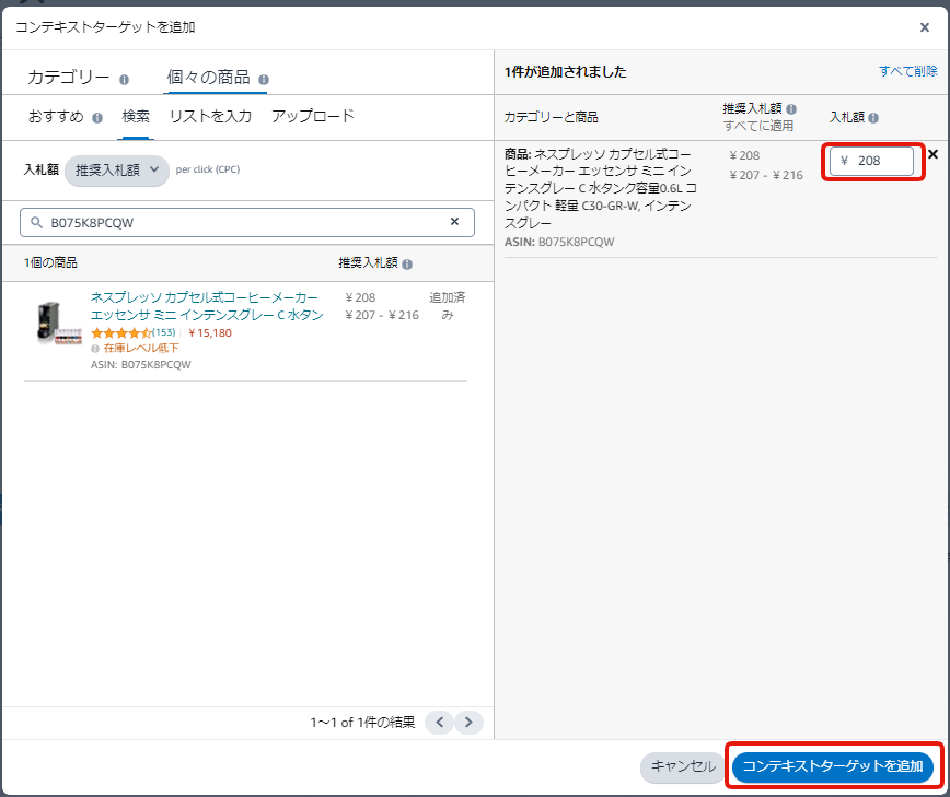 ⑤必要に応じて入札額を調整し、「コンテキストターゲットを追加」をクリックすれば設定完了です。