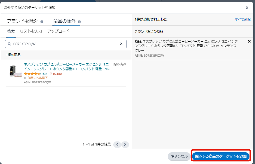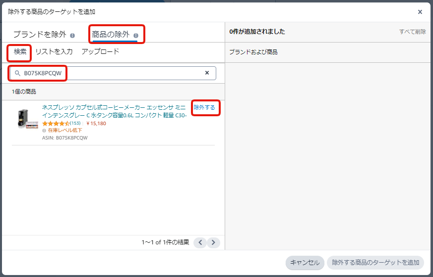 ④「商品の除外」で「検索」を選択し、除外したい商品のASINを検索して「除外する」をクリック