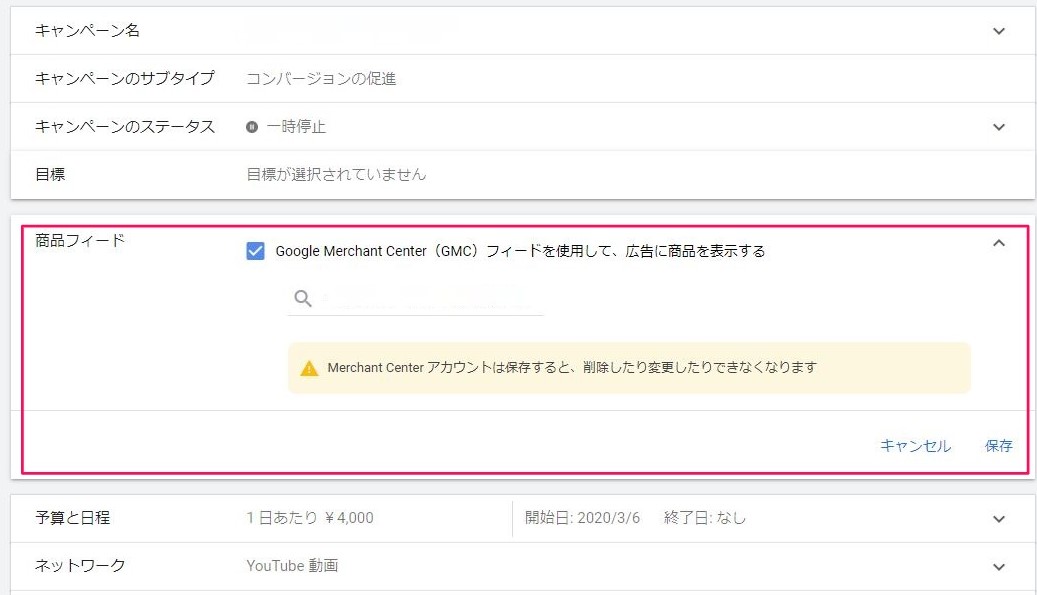 キャンペーンの[設定]にある[商品フィード]のセクションから「Merchant Center (GMC) フィードを使用して、広告に商品を表示する」にチェックし、対象の商品フィードを選択します。※一度保存すると対象の商品フィードの変更はできなくなるので注意してください