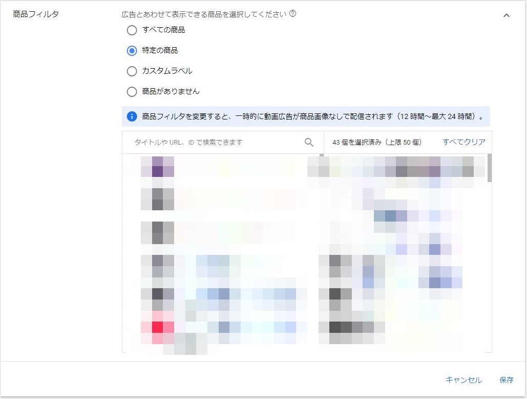 商品フィルタを変更すると、一時的に動画広告が商品画像なしで配信されます(12 時間~最大 24 時間)。商品の差し替えが発生することが予想される際はカスタムラベルを活用するなど工夫しましょう。