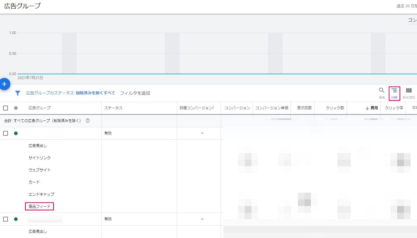 対象のキャンペーンを選択し、分割の[クリックタイプ]を選択することで「商品フィード」表示時のパフォーマンスを確認することができます。