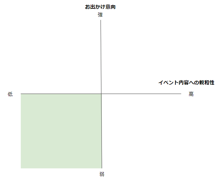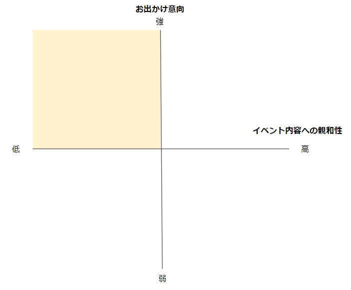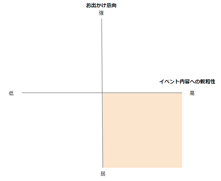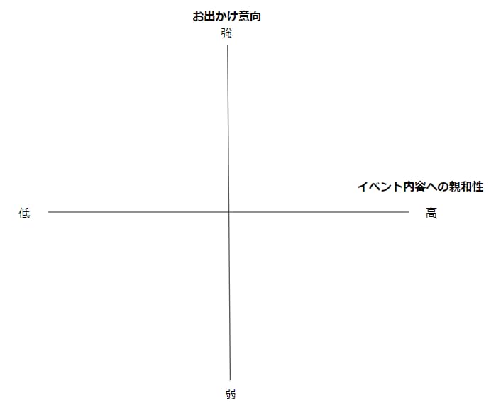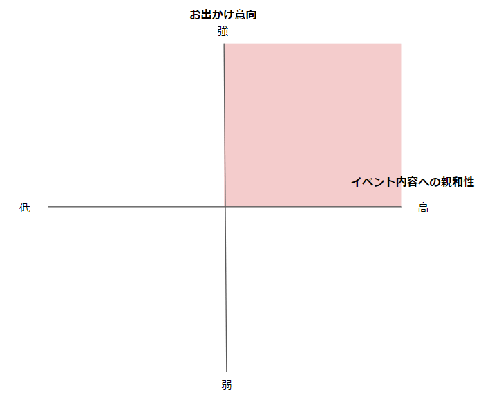まずはターゲットとなりそうなユーザーを「イベント内容への親和性」と「お出かけ意向」の2軸に分類しながら考えてみましょう。