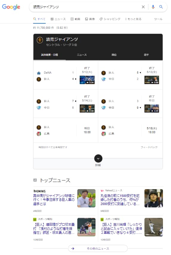 野球のチーム名を検索するユーザーは、必ずしもチケットを買いたいと思っているわけではありません。ためしにチーム名を検索してみると、「試合結果」「関連ニュース」という順番で表示されることからも分かるように、試合結果やニュースを確認したいという意図を持って検索する方が多いと考えられます。