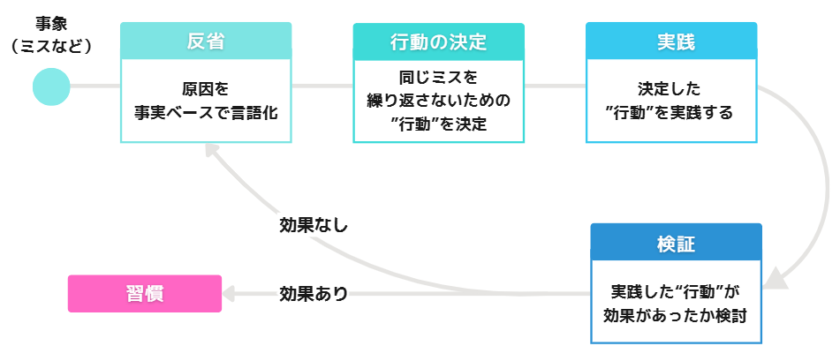 - 検証:結果を見て、改善されたかどうかを確かめる→ よかったら習慣化/うまくいかなければまた「反省」に戻る