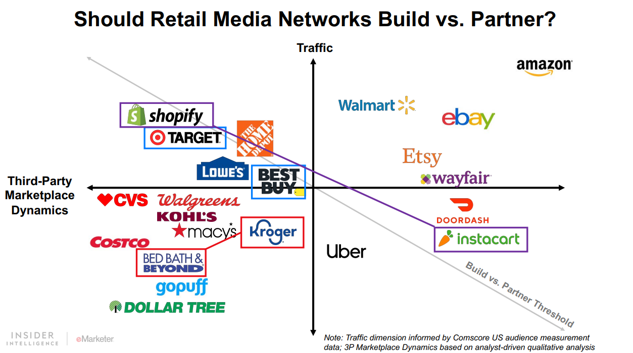 リテールメディアネットワーク(RMN)というと、Amazonのような大企業をイメージする人が多いかもしれませんが、それに留まりません。米国の市場のメジャーなRMNを見ますと近年では規模、アプローチ、専門性などが多彩なサービスが参入していることが分かります。eMarketerの分析では、トラフィック量とサードパーティマーケットプレイスとしてのダイナミクスの特徴を軸に、下記のように分類しています。