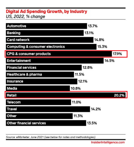 まずは、伸びているセグメントとの相性です。米国でデジタル広告の予算を増やしている業界を見てみると、特にCPG(消費者向けパッケージ製品)と小売が伸びていることが分かりますが、どちらもリテールメディアとの親和性が非常に高いセグメントです。