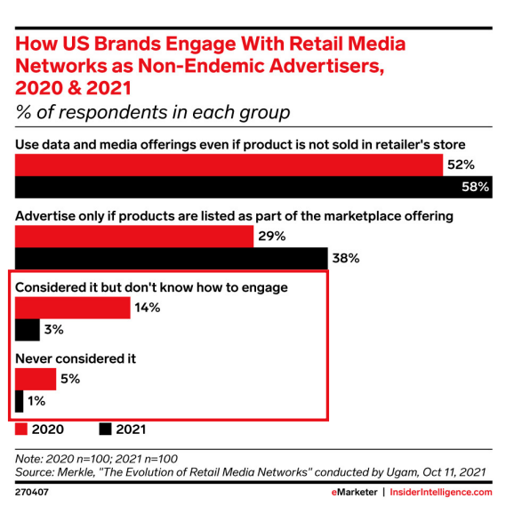 もう一つは、投資意欲の上昇です。興味深いことに多くのノンエンデミックブランド(プラットフォーム上で直接商品を提供していないが、ユーザーに潜在的な顧客としての価値を見出しているブランド)が、リテールメディアへの投資を増やしているようです。2020年にこのテーマに積極的に取り組んでいないブランドが19%だったのに対し、2021年にはその割合が4%にまで減少しています。eMarketer社は、この意識の変化の決定的な要因として、ファーストパーティデータへのアクセスを挙げています。